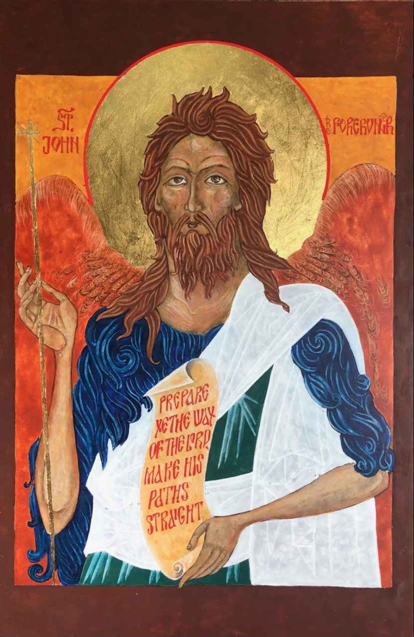 St. John The Forerunner Medium: Egg tempra and gold leaf on birch panel, 2021Dimensions: 17” h x 11” w